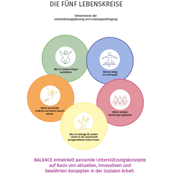 Zu den fünf von BALANCE entwickelten Lebenskreisen für ein gelingendes, selbstbestimmtes Leben, werden mit den Teilnehmer:innen Unterstützungsleistungen vereinbart.