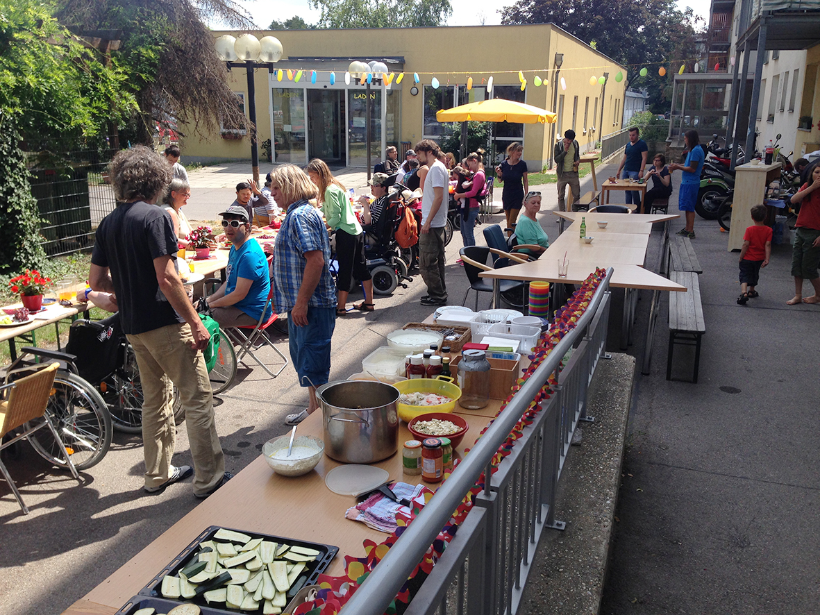 Der gemeinschaftliche Wohnraum und Vorplatz des Wohnverbundes ist Mittelpunkt des Lebens.
